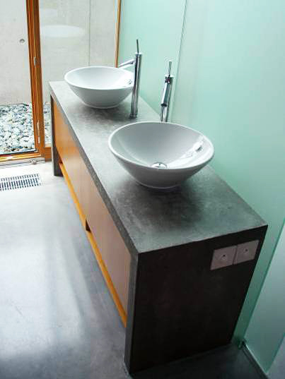 Betonový stolek pod umyvadla z pohledového betonu (ČESKOMORAVSKÝ BETON)Plocha z pohledového betonu je na dotyk velmi příjemná, navíc nepotřebuje žádnou náročnou údržbu a přesto dlouho vydrží krásná. Vzhled, který se někomu může zdát poněkud chladný, lze zútulnit použitím jiných materiálů, jako je například dřevo nebo sklo. Pohledových úprav betonu je celá řada, liší se především tím, jakým způsobem byl pohledový betonový povrch vytvořen či upraven.