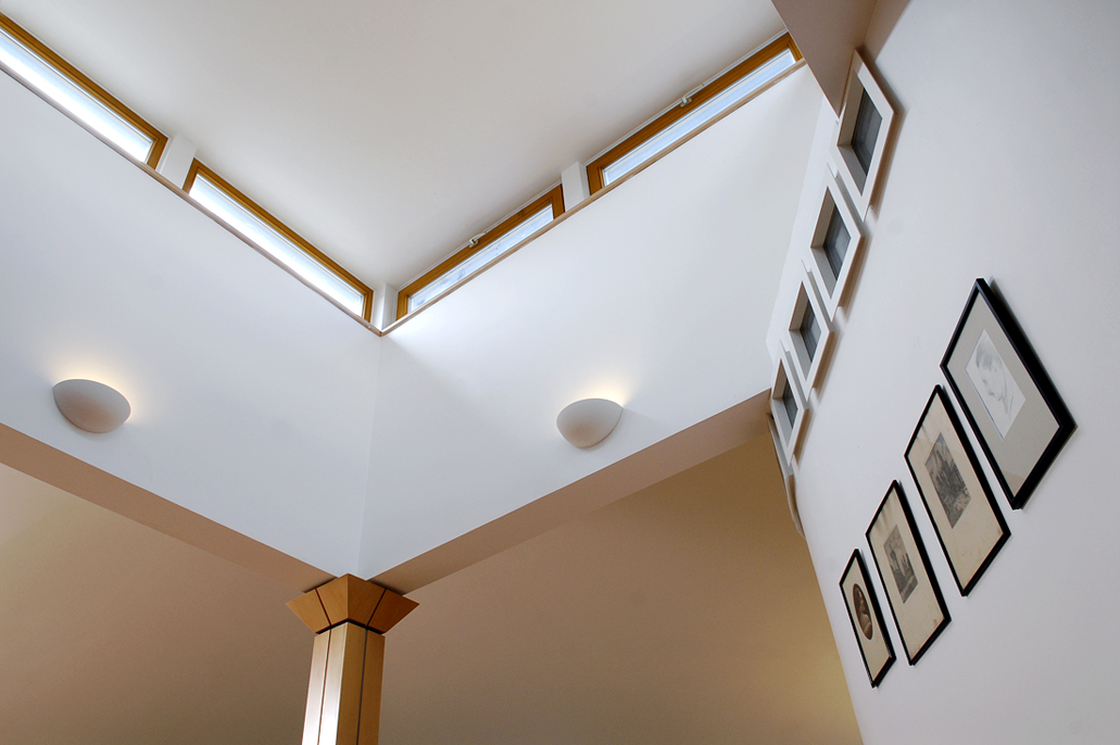 Podkrovní byt s přiznanými trámy nabízí nevšední prostor s jedinečnou atmosférou. Bílá kuchyňská sestava místo krásně prosvětlila a zároveň se stala zajímavým kontrastem k tmavým trámům.Půdní prostor nabízí díky dostatečné šířce a sklonu 38° bohatý prostor na zařízení pohodlného spodního patra a ve střední části zřízení lokální galerie. Vzhledem k zachování vazných trámů je spodní patro ve dvou výškových úrovních s rozdílem 450 mm. Do vrchní galerie se stoupá pomocí ocelového schodnicového schodiště.