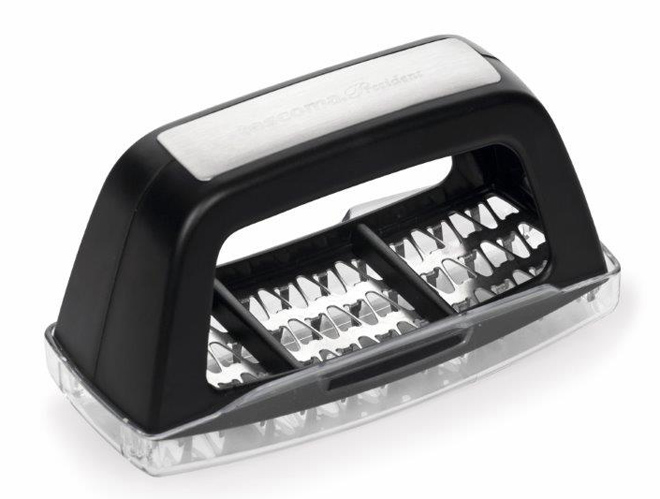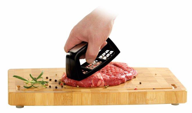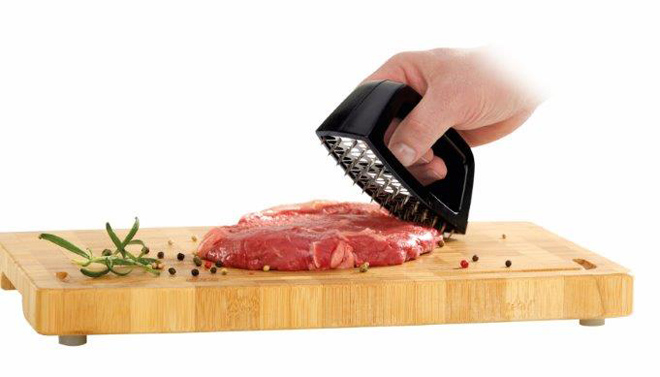 Tenderizer na maso PRESIDENT má dokonale promyšlený design a zcela nový způsob použití. Díky ostré čepeli z nerezavějící oceli a kolébavému pohybu se maso prokrojí a zvláční po celé ploše, aniž by se muselo naklepávat či jinak narušovat jeho struktura. Použití je velmi snadné a rychlé, každé sousto pak šťavnaté a křehké.