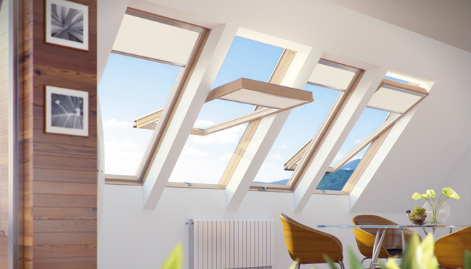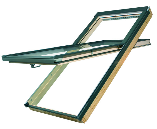 Okna se zvýšenou osou otáčení jsou kyvného typu s osou otáčení umístěnou nad středem. Spodní část křídla (pod osou závěsů) tak vlastně zajišťuje funkci výklopného okna a horní část umožňuje lépe prosvětlit podkroví. Křídlo je při otáčení v úhlu 0-45° přidržováno inovativním podpůrným mechanismem, který dovoluje ponechat otevřené okno v jakékoliv poloze v rozsahu těchto úhlů. Jediná střešní okna na trhu, která po namontování ve střeše se sklonem 39-43° splňují normu DIN 5034-1. Tato norma stanoví, že dolní hrana okna musí být ve výšce do 95 cm a horní hrana ve výšce minimálně 220 cm měřeno od podlahy.