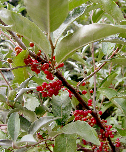 Hmyz lákají také aromatické květy hlošiny (rod Eleagnus). Jde o poměrně nenáročné keře vyššího vzrůstu, které příliš nemilují stín. Asi nejznámější je stříbřitá hlošina úzkolistá (česká oliva), ale chuťově zajímavější je hlošina okoličnatá a hlošina mnohokvětá s menšími plody: „Drobné světlé zvonkovité květy na jaře omamně voní a lákají hmyz, plody jsou červené bobule navinulé chuti, využití mají podobné jako rybíz. Sklízí se od září či října do mrazů, je třeba, aby byly řádně vyzrálé, případně je lze nechat po sklizni pár dní dojít,“ vysvětluje naše průvodkyně.