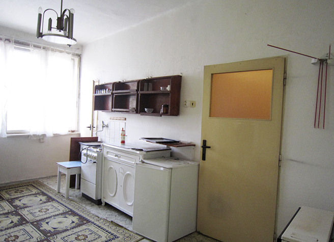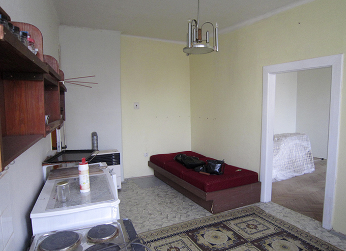 Po rozsáhlém bourání se dispozice vyčistila a otevřela dennímu světlu. Nově vznikly pouhé tři místnosti: původní předsíň prosvětlená ze dvou stran nadedveřními světlíky, velkorysá koupelna s toaletou a obytná místnost s kuchyňským koutem.