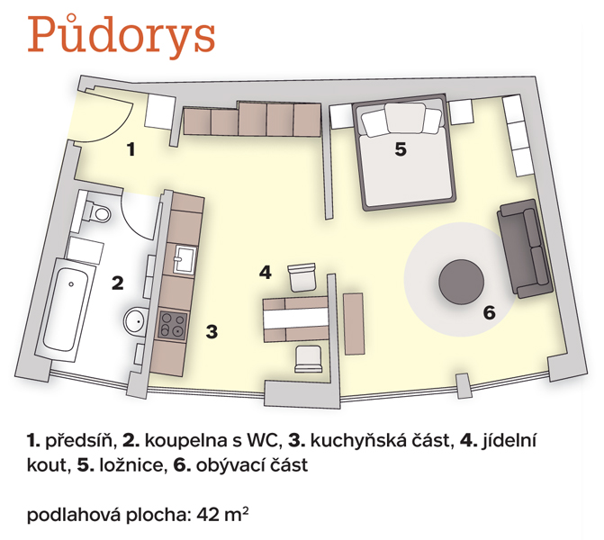 První fází návrhu byly nezbytné dispoziční úpravy. Malý byt kategorie 1+1 rozděloval 42 m2 neefektivně mezi šest místností: předsíň, WC, komoru, koupelnu, kuchyň a pokoj.