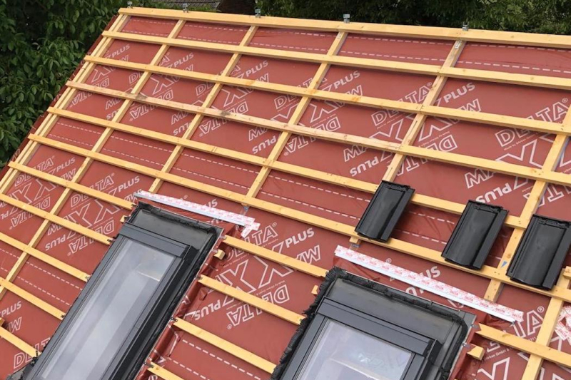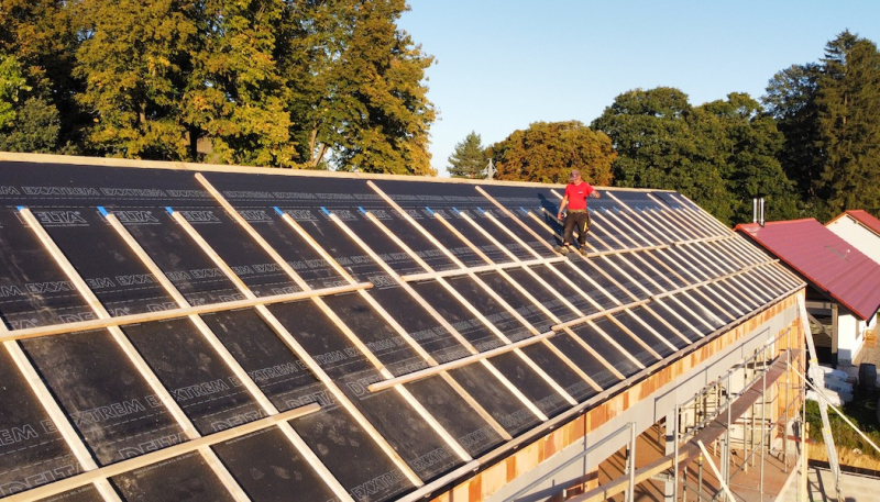 Pro účely sanace vedené z vnější strany vše v interiéru včetně obkladu zůstává beze změn. Není třeba se nikam stěhovat. Sanace parozábrany se provede z vnější strany pomocí parobrzdné fólie s proměnou difuzní propustností DELTA-NOVAFLEX, která umožňuje pokládku přes dřevěné krokevní prvky bez přerušení. Vzduchotěsné zpracování pomocí již zmíněných lepicích a těsnicích doplňků je i zde nezbytné. Vše je orientováno na maximální jednoduchost a účinnost provedení. Naším cílem jsou funkční střechy a ne „pouze“ prodaný materiál. Po vzduchotěsném zpracování parobrzdy pokračujeme v kompletaci ostatních vrstev střešního pláště až do finální podoby.