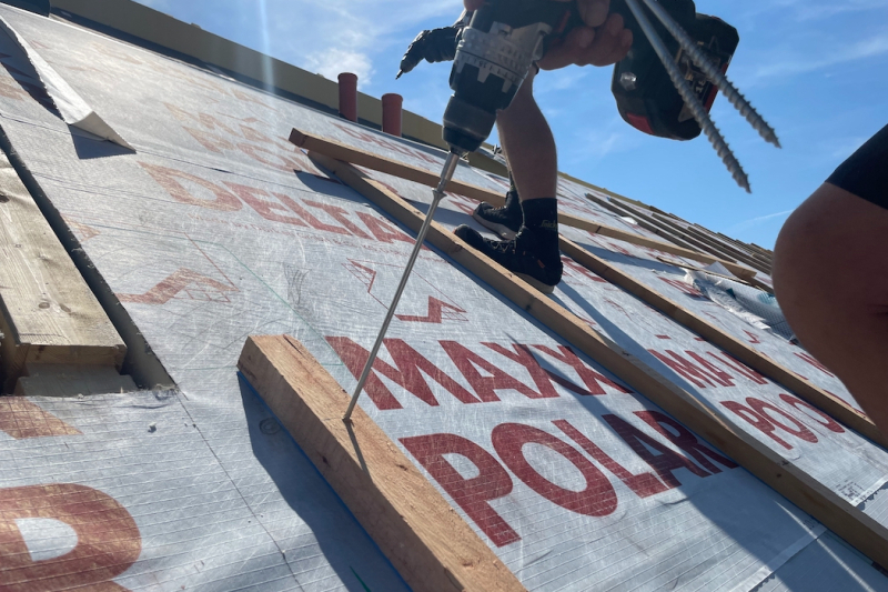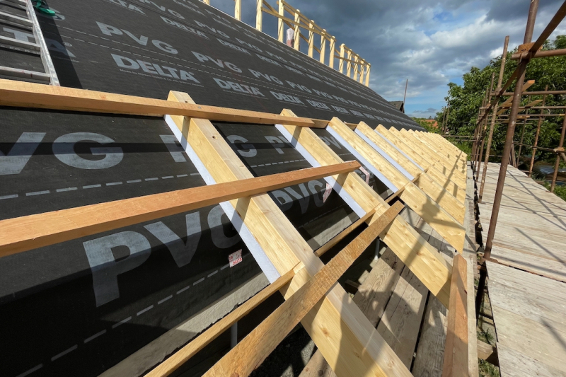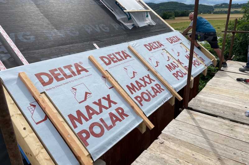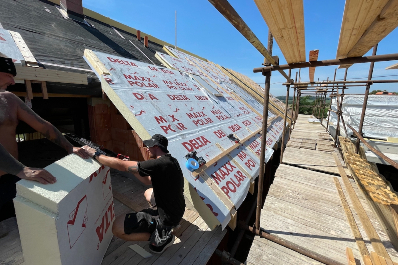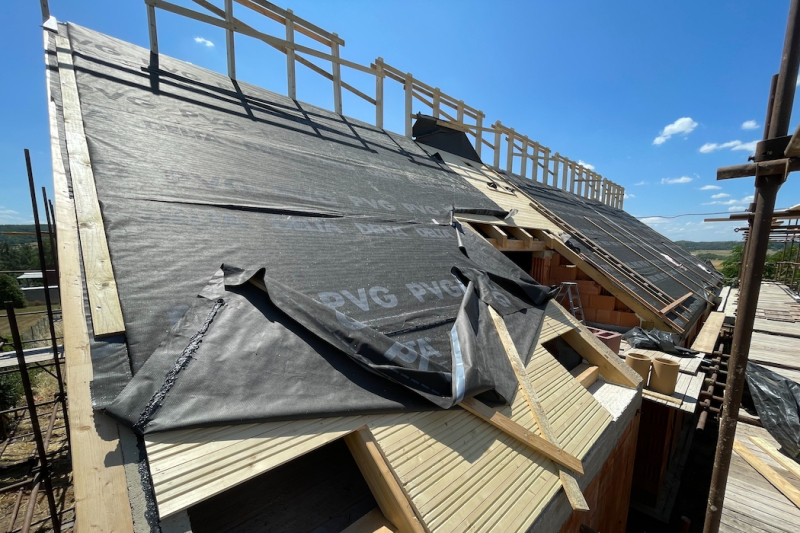 Pokládka parotěsné fólie na pohledový záklop. Při vzduchotěsném a tím zároveň i vodotěsném zpracování má funkci dočasného zastřešení stavby