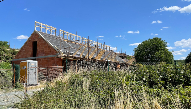Přesah střechy je tvořen krokevními námětky. Takové řešení umožňuje jednoduše proveditelné vzduchotěsné napojení parozábrany na zděné konstrukce