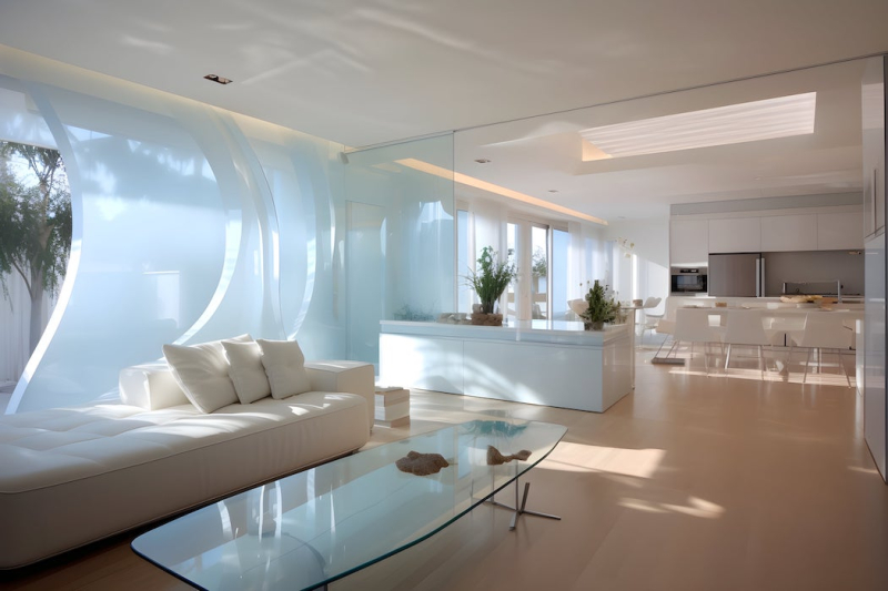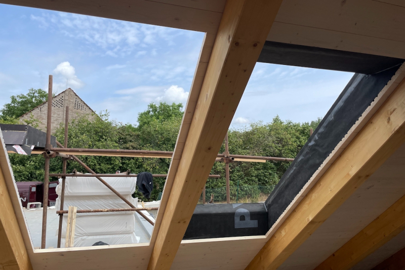 Pohled z vnitřní stany na vzduchotěsně osazený rám, pohledový krov a záklop