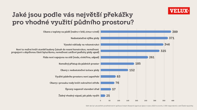 Za nejčastější důvod, proč domácnosti půdu více nevyužívají, přitom rodiny uvádějí vysokou letní teplotu a naopak chlad v zimě (39 %), následují vysoké náklady na rekonstrukci (35 %). Zatímco tyto důvody lze vyřešit, jiné využití půdy skutečně komplikují – mezi ty patří především nemožná rekonstrukce kvůli ohrožení statiky domu (32 %) či nedostatečná výška půdy (37 %).
