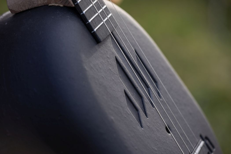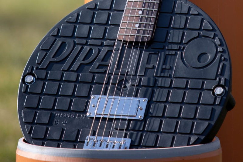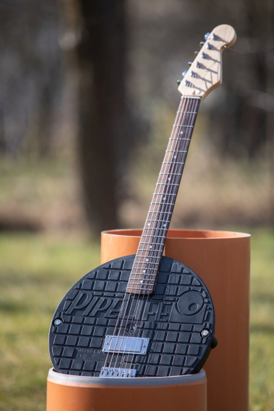 U staveb je mnoho důležitých prvků skryto pod vrstvou omítek, asfaltu, případně dalších materiálů. Podobně je tomu i o elektrofonických kytar, jejichž zvuk je přenášen prostřednictvím snímačů ukrytých pod lesklým kovovým krytem. Tato skutečnost mě přivedla k myšlence vytvořit netradiční „cigar box guitar“ z víka odpadní šachty Pipelife. Zvolil jsem plastovou variantu, která mně vyhovovala velikostí i vhodným spodním žebrováním. Pevnost je totiž důležitou vlastností jak u těla kytary, tak u zmíněného víka. Ač se to možná nezdá, napnuté struny kytary vytváří značný tah, odklon v rozmezí 5 mm zcela znemožní hru. Plast je materiál, který lze obrábět frézováním, proto jsem všechny otvory naprogramoval pro CNC frézku, což značně usnadnilo montáž. Zbývající prvky jsem použil z běžných kytar. No uznejte, že ta magická černá jde dobře k leštěným chromovaným prvkům?
