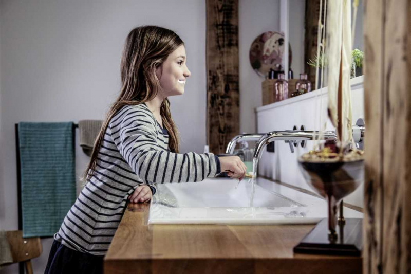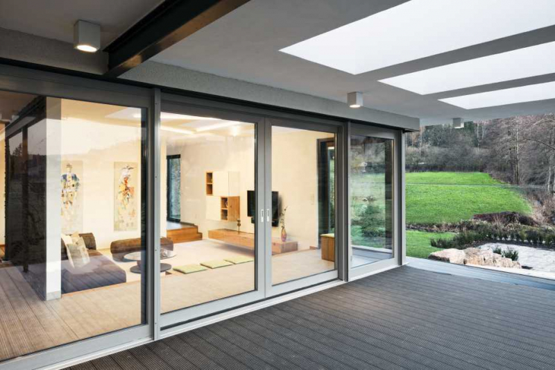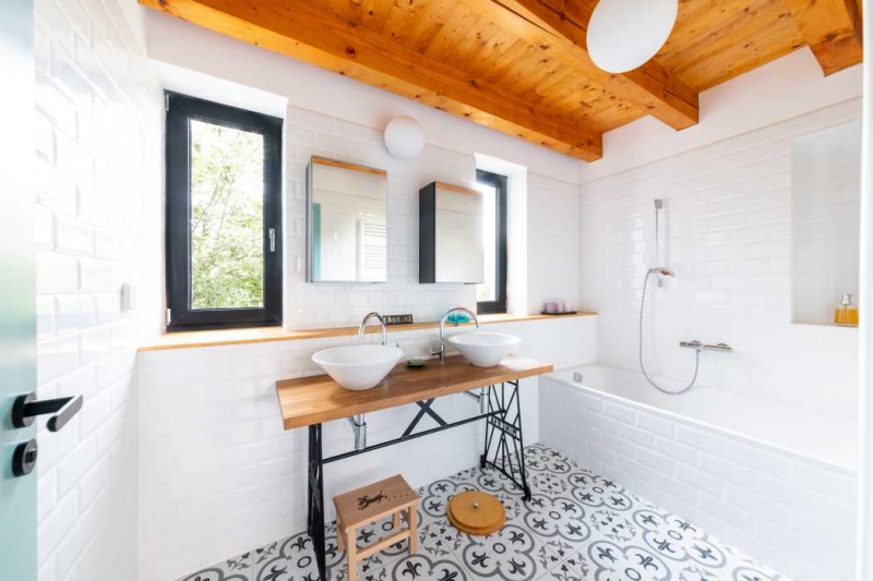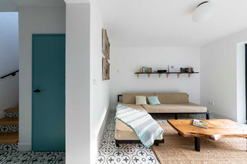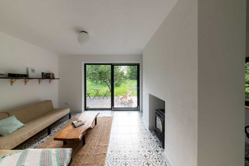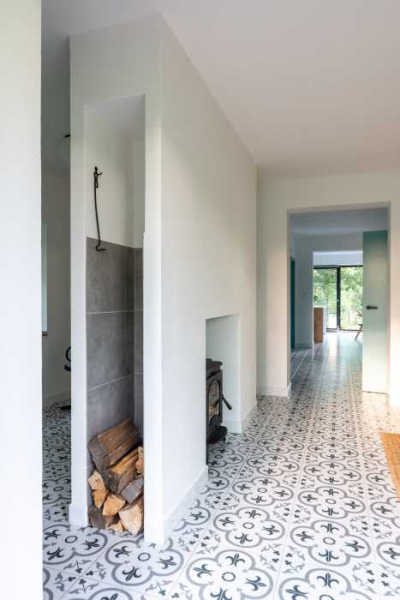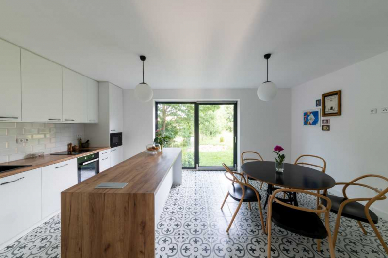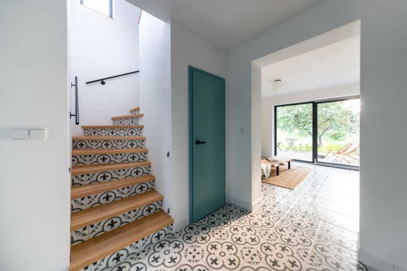 Oblíbenou je rovněž terasa poskládaná ze smrkových prken (při stavbě používaných jako bednění či lešení). Povrch stačilo obrousit a několikrát natřít směsí dřevního téru a fermeže. Překvapivě třetím rokem prkna odolávají dešti, slunci, sněhu a vypadají, jako v momentě, když je smontovali. „Doma jsme nechtěli zůstat jen u bílé a šedé, proto jsme sáhli po šik mentolové na dveřích. Výrazným prvkem je určitě i dlažba s květinovým dekorem probíhající v ploše bez přerušení. Připomíná nám louku, kterou jsme domem zabrali,“ uzavírají spokojeně majitelé.