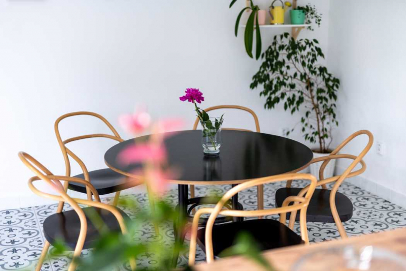 „Lidový‘ troj-trakt má zkrátka všestranné výhody. Už samotné nosné zdivo totiž jednotlivé trakty/zóny akusticky odizoluje. V rámci každého traktu jsem si proto mohl dovolit jen obyčejné příčky o tloušťce 11,5 centimetrů. Místnosti s podobným provozem, tudíž nebylo nutné mezi sebou navíc odhlučňovat,“ vysvětluje architekt a pokračuje: „Nízký rozpočet na interiér jsem bral jako výzvu. Upřednostnili jsme atypické výrobky z kvalitních materiálů před masovou produkcí. Někdy jsme recyklovali – židle TON jsme koupili z vyřazeného interiéru kavárny,“ říká Zdeněk, který rozkresloval zařízení včetně kuchyňské linky vyrobené v truhlářství Holoubek nábytek.