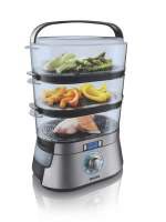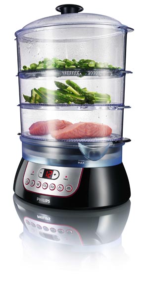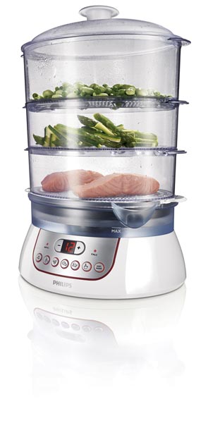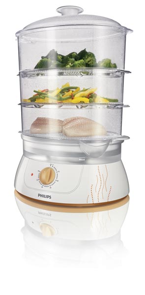Philips představuje parní hrnce s příkonem 900 W, které tvoří základna se zásobníkem vody s kapacitou 1,1 l, následuje tzv. Flavour Booster, zvýrazňovač chutí s táckem pro odkapávání, tři napařovací mísy s kapacitou 2,5 l, 2,6 l a 3,5 l, mísa na polévku nebo rýži a víko. Samozřejmě není nutné vždy využívat všechny napařovací mísy. Vyšší model Philips HD 9140 v černém nebo bílém provedení s digitálním časovačem je vybaven ovládacím panelem kde jsou mimo jiné čtyři přednastavená tlačítka pro přípravu ryb, zeleniny, brambor a kuřecího masa. Navíc se parní hrnec po uplynutí každého napařovacího programu automaticky přepne do režimu udržování teploty. Teplota pokrmu se udržujte dalších 20 minut. |