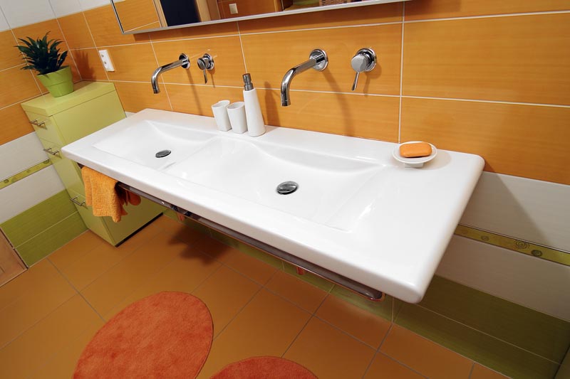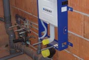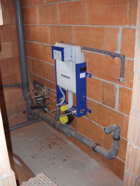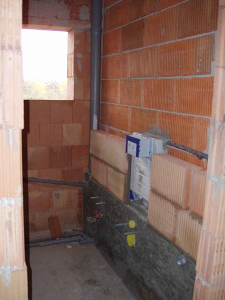 | Po odchodu instalatérů bylo ještě potřeba obezdít resp. obetonovat podomítkové moduly Geberitů. Protože je pod nimi silné odpadní potrubí, nebylo by na co pořádně postavit cihly, tak jsem spodní část zalil betonem. Prý i tak se to dělá, aspoň to bude držet pořádně. Jen aby se to nemuselo někdy opravovat.