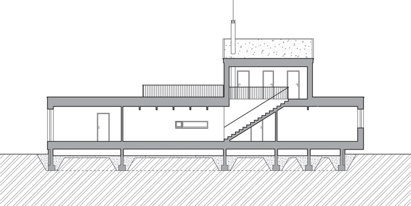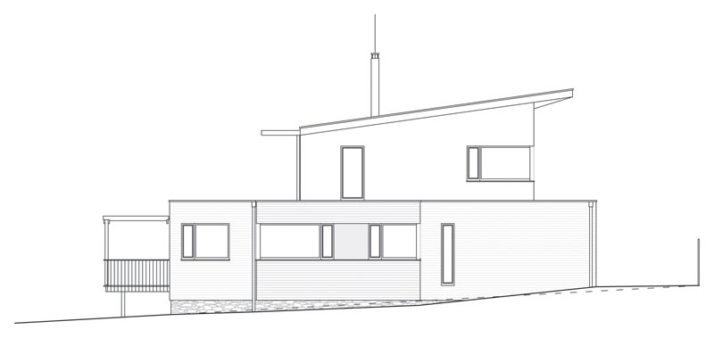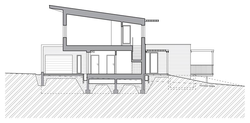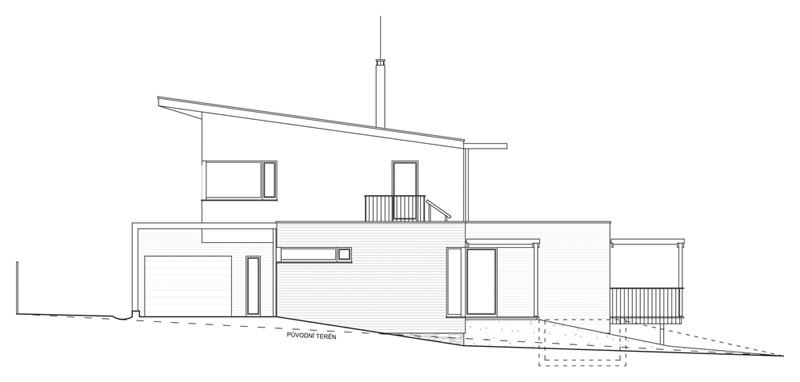 Rodinný dům je výtvarnou kompozicí tří hmot, půdorysně vycházejících z tvaru pozemku. Je situován rovnoběžně s jeho severní hranicí, což je podmínkou pro ideální orientaci osluněných průčelí s obytnými místnostmi na jih/západ. Zároveň je tak vyhověno podmínce dosažení maximálních solárních zisků v prostorách obytných místností a tím k naplnění jednoho z klíčových požadavků pro energeticky úsporné domy. Zároveň se však musí zachovat stávající řád zástavby podle situace k územnímu rozhodnutí. Toto řešení umožňuje jednak minimalizovat odstupovou vzdálenost novostavby od severní a východní společné hranice pozemku na vyhláškou požadované hodnoty a při tom optimálně využívá rekreační potenciál pozemku. Nekonfliktní začlenění novostavby do kontextu okolní zástavby spočívá v nedominantním působení. Nízká horizontální silueta podélného křídla s převýšenou podkrovní částí je uložena na vrstevnici, přimyká hmotu domu k mírnému svahu a tvoří tak pohledovou podnož střešní nástavbě, jejíž rovněž zelená pultová střecha kopíruje sklon terénu. Toto řešení také minimalizuje zemní práce nezbytné při založení domu do mírného svahu.