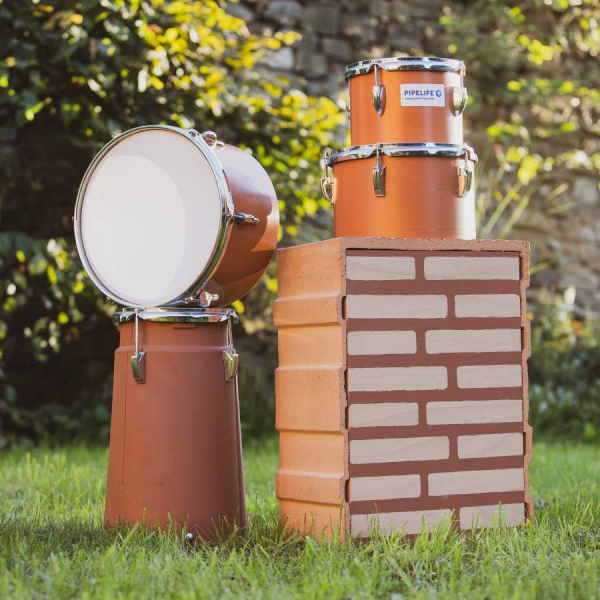Pro vytvoření soupravy bubnů, jaké známe z hudebních sestav současných kapel, bylo zapotřebí využít jiných materiálů, především s větším průměrem a nižší váhou. V tomto směru mě velmi oslovil sortiment Wienerberger – Pipelife zaměřený na plastové trubky různého zaměření. Šachty na odpadní a dešťovou vodu jsou prvky, které jsou ve stavbách skryty pod vrstvou betonu a zeminy, jejich vlastnosti jsou ale po pevnostní stránce na nejvyšší úrovni, což je výborný základ i pro hudební nástroj. V rozmanité nabídce průměrů nebylo problém najít vhodné varianty, které lze „napasovat“ na bubenické blány standartních rozměrů. Výsledek je až nečekaně dobrý a zcela jistě snese srovnání s profesionální bicí soupravou.