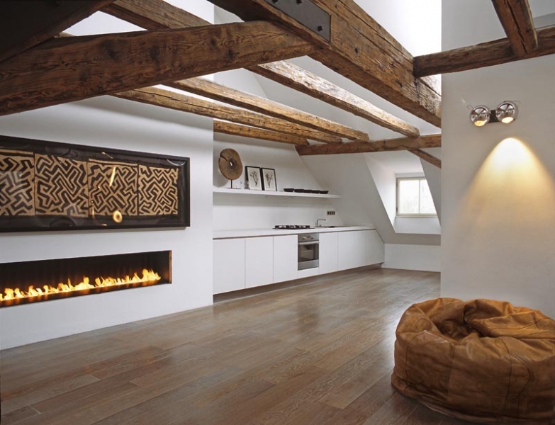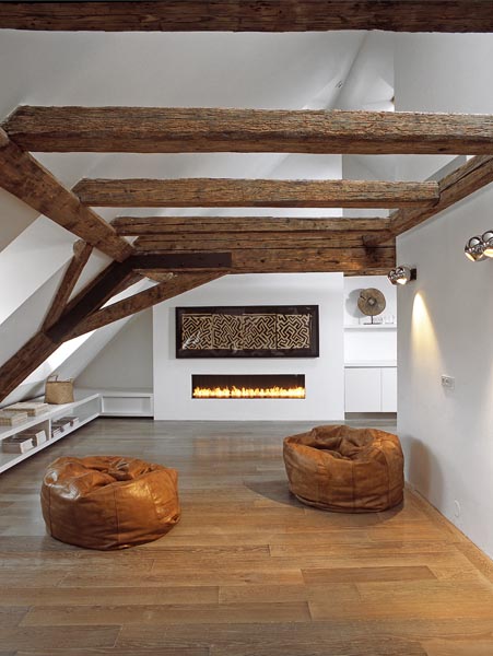 Druhý krbZařízení v duchu současných trendů je až na výjimky vyrobeno na míru prostoru. „Kontrastem ke strohým trámům jsou minimalistické tvary. Preferuji jen nejnutnější zařízení, tehdy totiž vyzní jednotlivé kusy. Abychom nepotlačili původní charakter, volili jsme jednoduché formy a neutrální barvy,“ konstatuje architektka a s úsměvem dodává, že všechno je v pořádku, když už není co ubírat. I na její popud je interiér dozařízen doplňky, které vesměs pocházejí z jihu Afriky a dokonale dotvářejí charakter prostoru.
