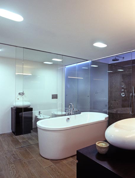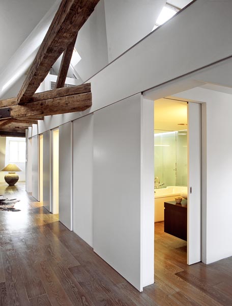 Citlivé zásahy„Celý krov bylo potřeba zachránit,“ konstatuje Šárka Špačková a dodává: „Trámy byly v naprosto dezolátním stavu, bylo nutné je s největší opatrností restaurovat a citlivě ošetřit. Některé části bylo nutné nahradit ocelovými výztuhami. Ponechali jsme i část původního schodiště. Samostatnou kapitolou byla okna, jejichž vzhled se samozřejmě musel přizpůsobit příkazům památkářů. Abychom dosáhli v interiéru požadovaného výsledku, napadlo nás pátrat ve starých vedutách, Plickových fotografiích, nakonec jsme navštívili i Muzeum hlavního města Prahy. Z Langweilova modelu Prahy jsme zjistili, že zde původně existoval ve štítu vikýř,“ vzpomíná. Po nutných stavebních úpravách se začala připravovat dispozice, která je koncipována pro bezdětné obyvatele. Z tohoto důvodu bylo možno ponechat hlavní prostor nerozčleněný a oddělit jen intimní část. „Mnohem lépe tak vynikne i původní krov, který významně přispívá k celkové atmosféře,“ říká architektka a dodává, že i proto byla v koupelně použita stěna z čirého skla. Celkový prostor tak působí vzdušným dojmem, který umocňuje světlík vpouštějící do koupelny denní světlo. |