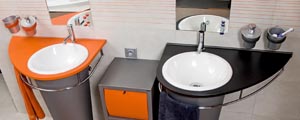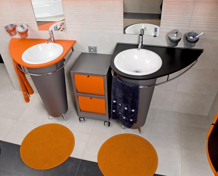 Ukázněná dynamikaDětské koupelně vévodí dvě kruhová bílá umyvadla zapuštěná do oranžové a černé desky velmi atypického tvaru a osazená na originálních kuželovitých nohách. Jejich tvar přispívá nejen k hravému výrazu koupelny, ale zároveň prospívá i ergonomii celku. Kontrastní barevnost činí koupelnu dynamickou, nikoli však znervózňující či agresivní. Stopy zaoblených linií nese i rohová akrylátová vana, která poskytuje dětem předškolního věku dostatek prostoru k vodním radovánkám. Prvek harmonických kruhů umyvadel je posílen kruhovými koberečky na podlaze a v celku místnosti citlivě vyvážen pravidelnými hranami závěsné skříňky ve tvaru kvádru a praktického kontejneru se zásuvkami. Kuželovitý detail nohy umyvadla je zase umocněm závěsnými dózami odpovídajícího tvaru, které zároveň i barevně naprosto korespondují se zvolenými barvami koupelny. Za velmi elegantní detail lze označit oranžové spárování světle béžových obkladů v horizontálních liniích na stěně s umyvadly, které působí decentně a umírněně. Jiný rytmus však dostává tato barevná kombinace na vertikálních žaluziích, jako by připomínala, že je čas si hrát. Jakmile čas her pomine, žaluzie lze snadno vyměnit a nadčasová elegance obkladů zůstane. „Především u dětských koupelen volte neutrální základ a osobitý výraz koupelně vtiskněte doplňky, které po čase snadněji a dostupněji vyměníte za nové,“ doporučuje Vendula Hladíková a pokračuje: „Práci si dejte také s výběrem nábytku.“ Kontejner na kolečkách splňuje hravý prvek, ale zároveň ho lze využít i jinde. Podlouhlý tvar skříňky kopírující vertikální linii skvěle vyhoví dětem i v pozdějším věku, když jim přibude pár centimetrů na výšku. Stejně tak tvarovaná a svisle upevněná zrcadla. „Při výběru vybavení zejména pro menší děti myslete na bezpečnost jeho užívání a dávejte pozor na ostré hrany,“ připomíná architektka. I dětská koupelna musí být funkční, příjemná a bezpečná. Ani zde byste neměli nic ošidit.