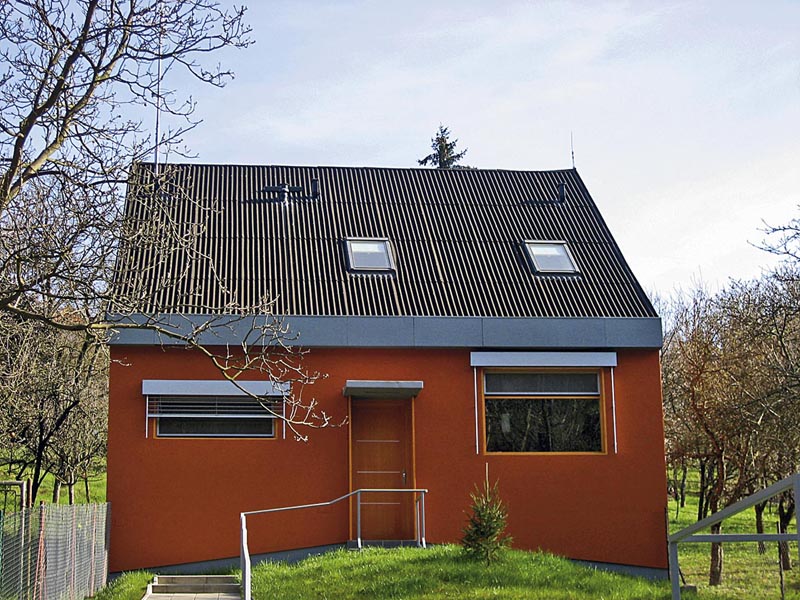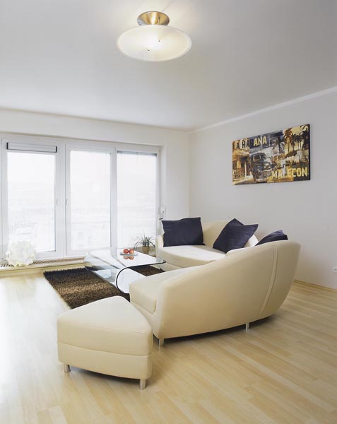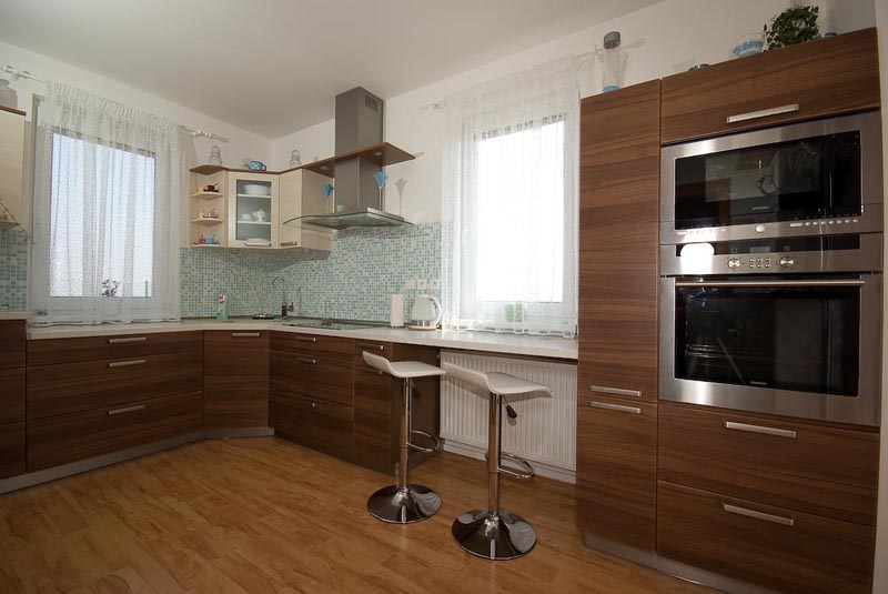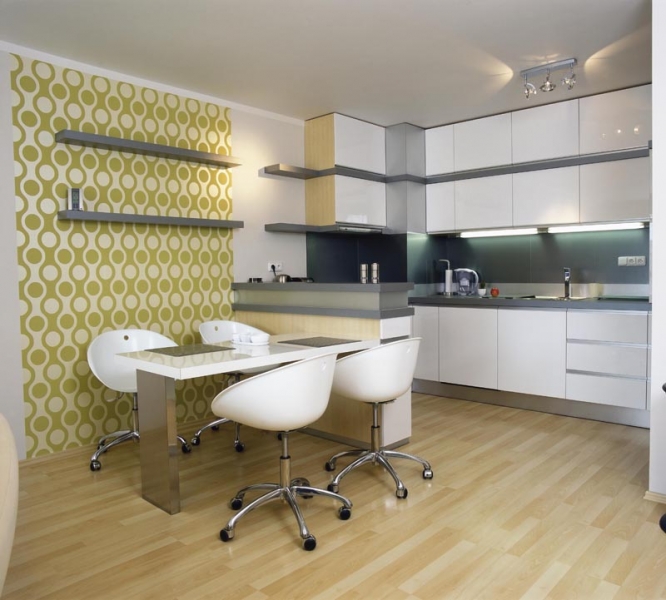 Členění a návaznostPůvodní řešení dvou obytných místností s odděleným kuchyňským koutem zavrhli a spojením obývací části s kuchyní vznikl prostor velký 42 m², jehož vzdušnost umocňuje jedna stěna plně osazená francouzskými okny. Díky dostatku denního světla je tak dobře prosvětlená i kuchyň vyplňující oba zadní kouty. Zatímco v obývací části je jen minimum nábytku, důmyslně zařízená a vybavená kuchyň, jejíž horní skříňky ve dvou řadách až ke stropu a spodní kusy nábytku poskytují velké úložné prostory, zajistí pohodlnou a rychlou přípravu pokrmů i jednoduchou údržbu. Varnou zónu kuchyňské linky uzavírá pult barového typu, na který navazuje jídelní stůl. Jeho silná deska je z jedné strany pevně připojena k pultu, druhou část podepírá masivní kovová noha. K němu zvolili pohodlné pojízdné židle se sedáky ve tvaru křesílek. Na celém integrovaném prostoru je patrná ruka zkušeného architekta. Plochu kuchyňského nábytku v provedení bílá fólie ve vysokém lesku člení zafrézované hliníkové úchyty, jednotlivé úrovně (pracovní desky, pultu, jídelního stolu) jsou zdůrazněny horizontálními pásy z kovolaminátu. V jeho stříbrošedé barvě je i pracovní deska a také obložení zadní desky. Bočnice kuchyňského nábytku mají stejně jako podlahová krytina povrch s designem světlého javoru. Optické členění jednotlivých zón (kuchyň, jídelna, obývací pokoj) podtrhuje i nátěr stěn třemi odstíny béžové barvy, efekt umocňuje pruh zelené tapety u jídelního stolu. |