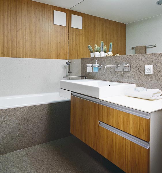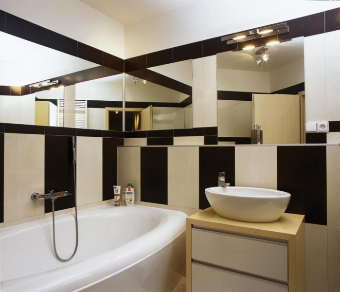 Zásadní změnu prodělala koupelna. Její zvláštní tvar mnohoúhelníku vyžadoval speciální řešení. Tvarovou rozháranost sladil velkoformátový obklad s dekorem tmavého dřeva a světlého mramoru a také velká zrcadla. Atypické, nepravoúhlé kouty byly využity k umístění úložných skříněk a pračky tak, že tyto kusy při vstupu neupoutají pozornost a neruší styl, který i přes větší množství zařizovacích prvků působí dojmem odlehčeného a vzdušného interiéru. SLEDUJTE REALITY SHOW – ZAŘIZUJI BYT!Čtenáři sami popisují průběh rekonstrukce a zařizování svých nových bytů a vše dokumentují fotografiemi.