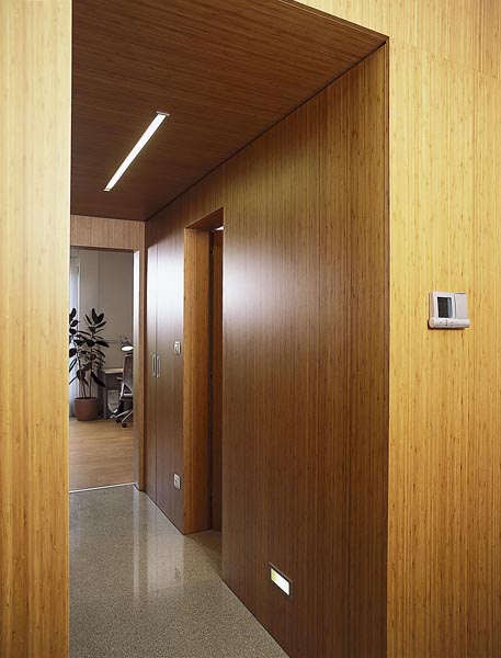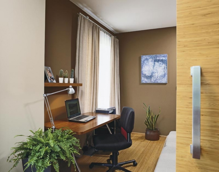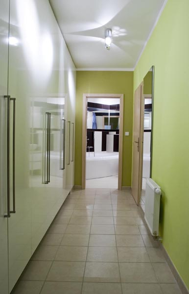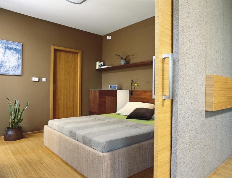 Omezení nábytku v ložnici a obývací části umožnila vysoká skříňová sestava, která je umístěna po celé délce stěny v podlouhlé předsíni. Předsíň bez denního osvětlení barevně ozvláštňuje nátěr ve dvou odstínech zelené barvy. Moderně a jednoduše zařízený byt vyhovuje současným potřebách jeho uživatelů. I když na jeho vybavení nešetřili, považují ho za aktuální, leč dočasné řešení. Až se rodina rozroste, dají prý raději přednost menšímu rodinnému domku. Kontakty: