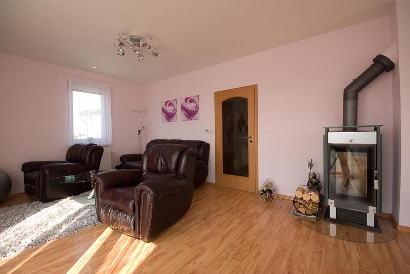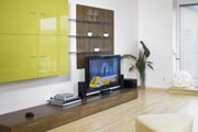 | Do obývací části si majitelé přivezli vlastní sedací soupravu a konferenční stolek, který je zhotoven z jednoho kusu tvarované skleněné desky. Na protější straně je jen jednoduchý nábytkový modul (IDC) v provedení zelený lak a tmavý ořech, jemuž dominuje rozměrná LCD televize.