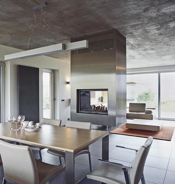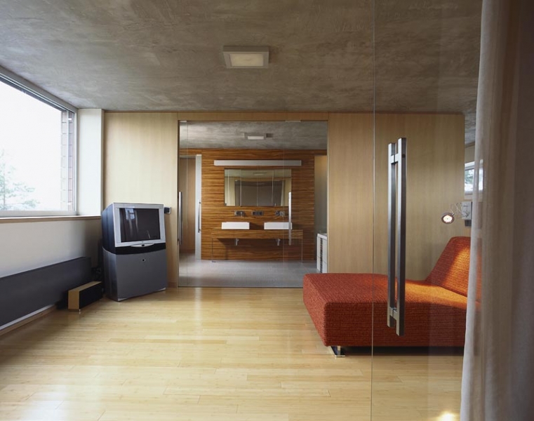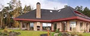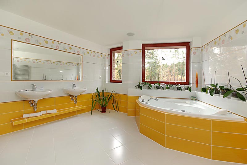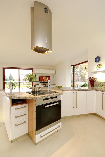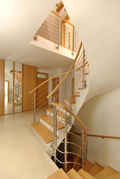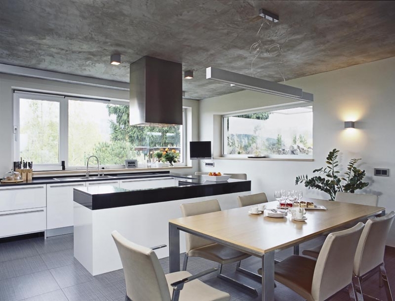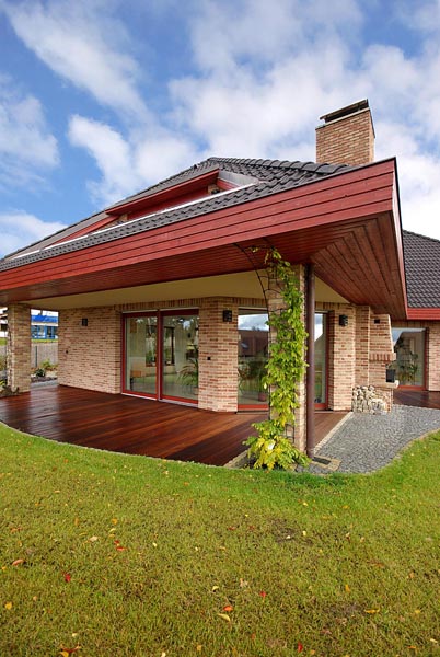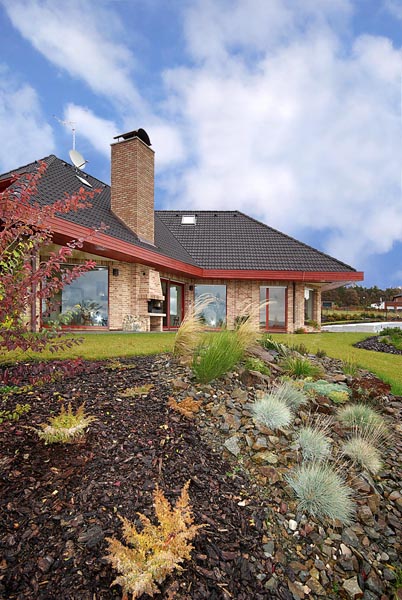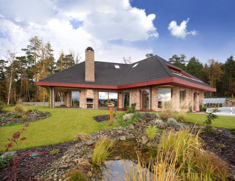 Půdorys krok za krokemStudie vycházela z přání zadavatele. Tak, jak manželé v průběhu projektování při konzultacích s architektem vznášeli další požadavky, se půdorys postupně měnil do stávající podoby. Má tvar široce rozevřeného písmene Y, obytná část je orientována k jihu, jako by otevírala náruč zahradě a slunci. Dům je situován zhruba uprostřed zahrady tak, aby maximálně využil všech krásných výhledů do okolí. V centrální části domu se nachází prostorná schodišťová hala, na niž navazuje společná obytná část, expandující ven na terasu. Velké prosklené plochy a podlahy v jedné úrovni umožňují volný přechod z interiéru do exteriéru. Garáž a technické zázemí zabírají samostatnou část dispozice tak, aby nijak nerušily život rodiny. Podkroví je vyhrazeno soukromé zóně, ložnicím a koupelnám. „Je příjemné, že každá místnost včetně haly má přirozené denní světlo, to považujeme v rodinném domě za důležité,“ vysvětluje naše hostitelka. |