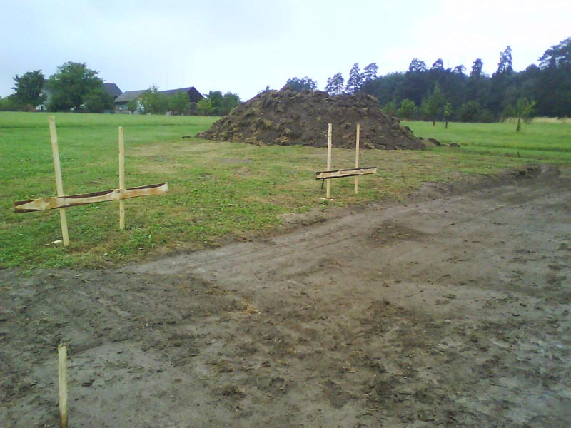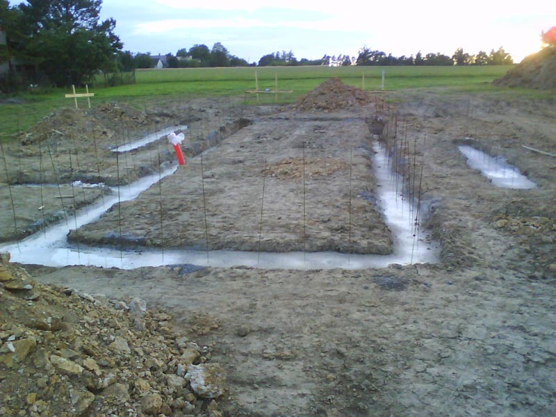 Po vykopání pásů jsme navezli do výkopu 0,1 m strusky a poté jsme do něj umístili průchod na kanalizaci a vodu. Vodováhou jsme si vyměřili budoucí hladinu betonu v pásech a označili ji dřevěnými kolíčky. Zemnící drát jsme nyní nepokládali, protože jsme jej bohužel nesehnali. Podle názoru projektanta je možné tento pásek uložit i později v blízkosti výkopu. |