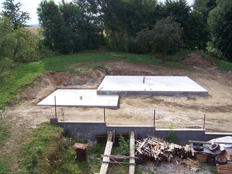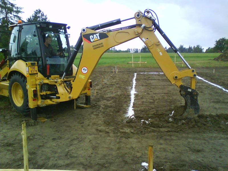 Stavební úřad nám konečně vydal povolení ke stavbě (ohlášení stavby) a územní souhlas. Dokumenty nabyly ihned platnost a přebrali jsme si je přímo na úřadě. S nimi, katastrální mapou a zástavní smlouvou jsme jeli do banky a za dva dny jsme již měli peníze z hypotéky na účtu a mohli začít. Nechali jsme si nejdříve bagrem sejmout ornici do roviny a odborná firma nám vyměřila lavičky pro základovou desku. Tyto dny byly zrovna velké průtrže mračen, takže práce byla delší než obvykle a nebyla právě příjemná. |