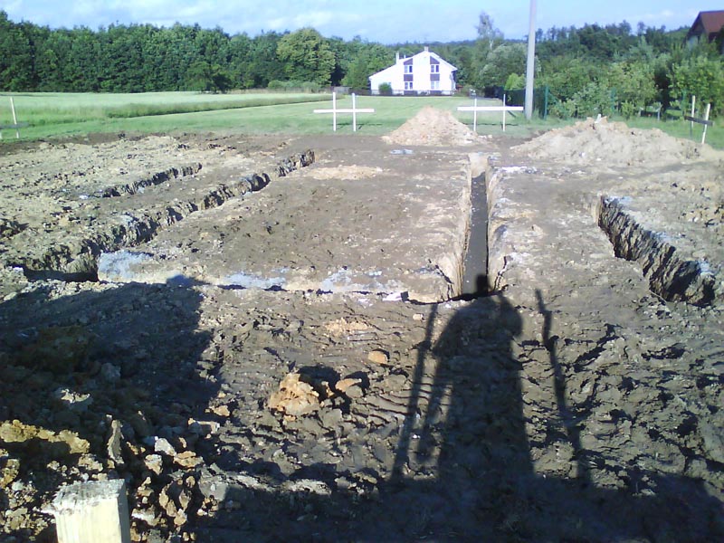 | Druhý den přijel bagr znovu a vyhrabal základové pásy nosných zdí v šíři 0,3 m. Vzhledem k podmáčenému podkladu byla práce opět složitější. Během ní jsme překopli asi čtyři drenáže, takže potom budeme muset obkopat celý dům a drenáže napojit.