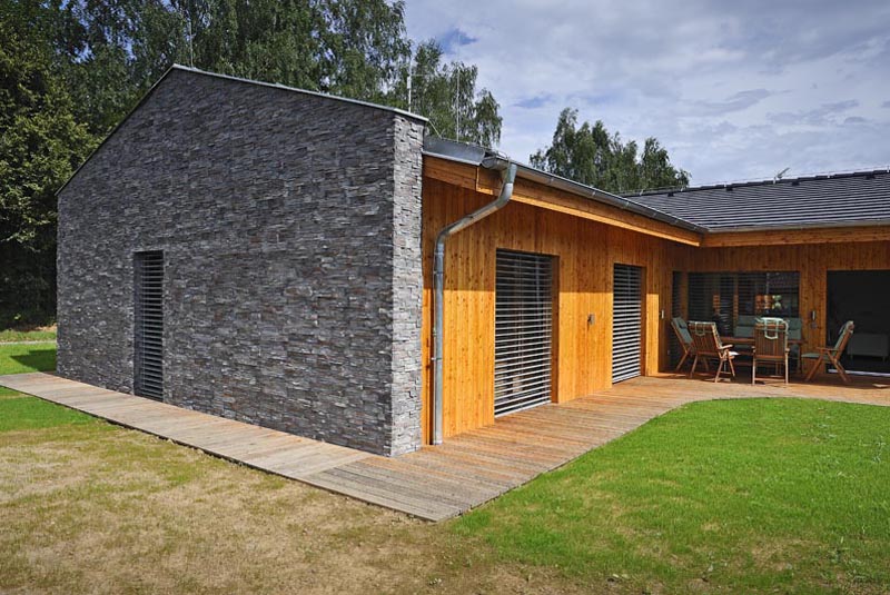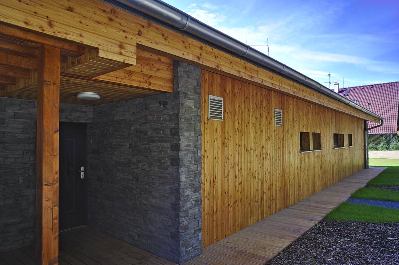 Promyšleně je řešen i obvyklý problém dřevostaveb, a to nízká schopnost akumulace tepla. Dům postavený konstrukčním systémem two-by-four je zateplen cca 500 mm izolace, fasáda je obložena modřínovým dřevem s větranou vzduchovou mezerou. Umělý kámen na jižním a západním průčelí je na pohled k nerozeznání od lomové břidlice, a to bez negativních vlastností přírodního kamene – nesaje vlhkost a má menší hmotnost.