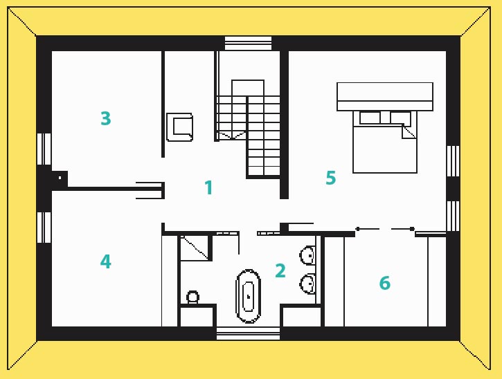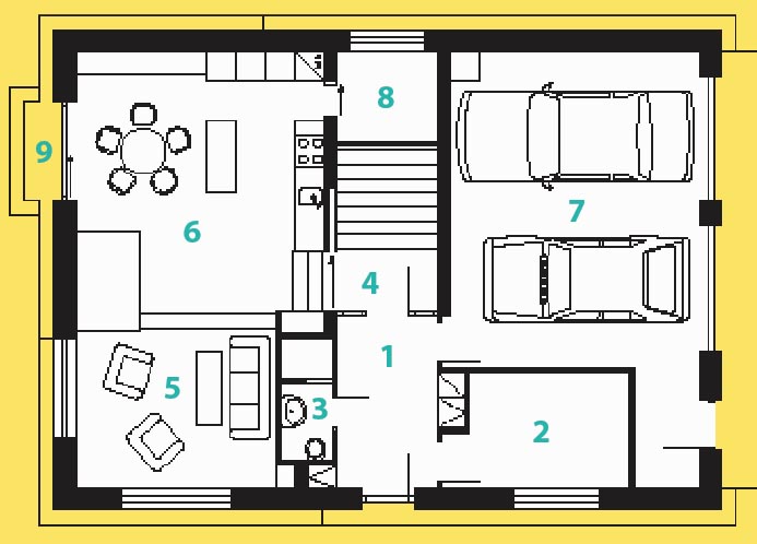 Úsporný koncept nutně začíná úspornou dispozicí. Má tvar písmene L, vnitřní roh s terasou a zahradou je orientován na jihozápad, kam vedou také francouzská okna z obytných místností. Hlavní vstup se nachází na severní straně, podél severní fasády jsou v duchu zásad nízkoenergetického stavění umístěny „chladné“ provozy – komora, technická místnost, koupelny a úložné prostory.