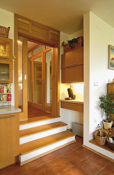 Přehřívání interiéru zabraňují kromě dobré tepelné izolace obvodového pláště také přesahy střechy a venkovní hliníkové žaluzie. Důležitou roli hraje i vyvážený poměr prosklených ploch a plných stěn, který v našich klimatických podmínkách představuje věčné dilema nejen pasivních domů: maximální solární efekt na jaře a na podzim versus přehřívání v létě. V tomto směru se majitelé domu nedrželi striktně přesných výpočtů, ale selského rozumu: „Naším cílem nebylo za každou cenu splnit tabulková kritéria pro pasivní dům, ale získat příjemné komfortní bydlení.“
