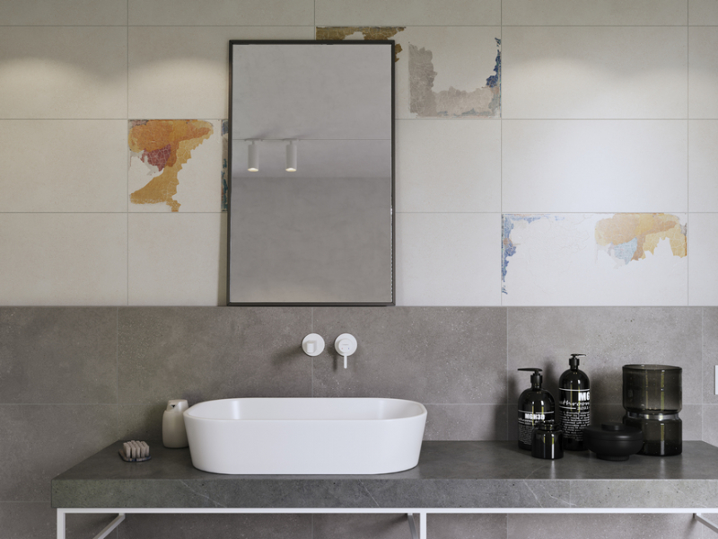 - 30 x 60 cm rektifikovaná obkládačka zdobená dekorací DryFix – barevné provedení napodobující starou oprýskanou omítku pro oživení koupelny i použitím kusových dekorací v ploše; barevná dekorace řezaná i do mozaiky 5 x 5 cm