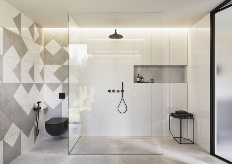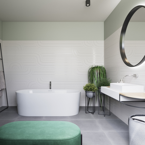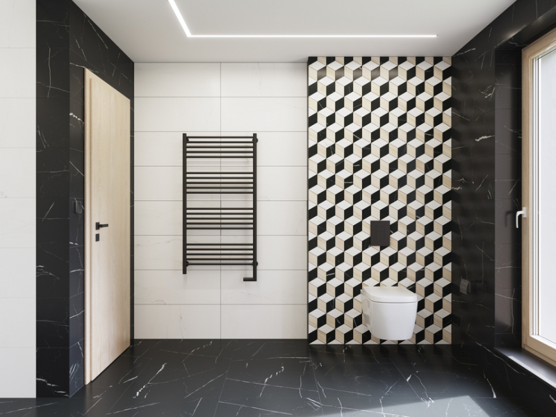 - rektifikované obkládačky 30 x 60 cm – dekory s liniovým vzorem, se kterými se dají vytvářet unikátní vzory na každé stěně v černé a bílé barvě