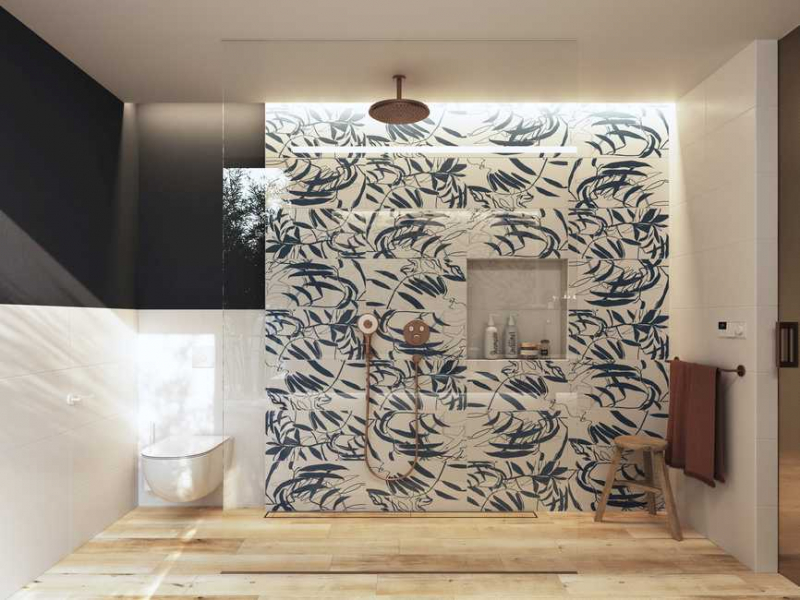 - jednobarevná nerektifikovaná obkládačka 30 x 60 cm pro kombinaci s dekoracemi listů v moderních barvách tmavě modrá a zelená