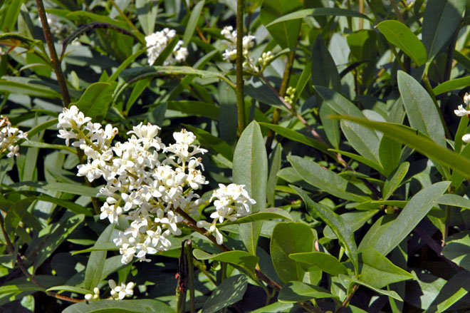 Z listnatých neopadavých keřů se nejčastěji setkáváme s ptačím zobem obecným (Ligustrum vulgare) nebo se zimostrázem vždyzeleným (Buxus sempervirens).
