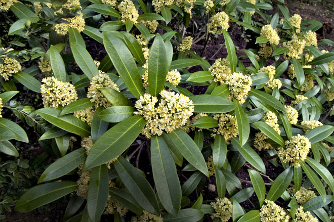 Podobně teplomilný keř skimmie japonská (Skimmia japonica) se hodí mezi jiné druhy jako oživení. Dorůstá výšky asi 1,5 metru (ale prodává se množství nižších odrůd, které se hodí spíše do nádoby na balkon), kvete časně zjara a během podzimu a zimy keře krášlí rudé plody. Nesnáší přímé slunce.