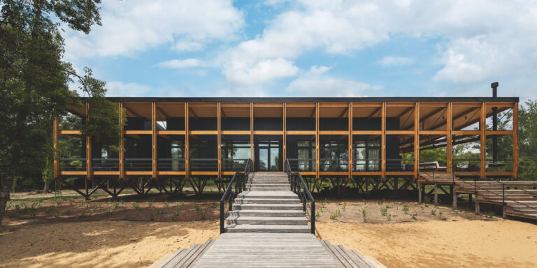 Najít dům u jezera a zároveň poblíž města je výzva, a to i ve Švédsku, které oplývá mnoha jezery. Ale mladá dvojice architektů měla štěstí. Místo skleněného domu si však nakonec navrhla „introvertní stavbu“ – impulsem ke změně byla noc strávená venku po zhlédnutí hororu… V domě uprostřed divočiny si nyní místo obrazů užívá soukromou galerii – okny orámované výhledy na jezero z pohodlí domu.