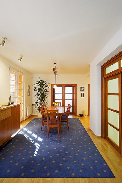 V přízemí se původně nacházela malá kuchyň, jídelna a obývací pokoj se schodištěm vedoucím do patra. Spojením těchto tří místností do velkého obývacího pokoje s jídelním koutem autor rekonstrukce, architekt Emil Mikšovič, vytvořil nové jádro domu. Schodiště zůstalo na svém místě a prosvětlilo se střešním nadsvětlíkem. Dispozice se rozrostla západním směrem o pracovnu s knihovnou a novou kuchyň, na severní straně o nový vstupní prostor se zázemím a ve východní části vznikla rozšířením garáže prostorná pracovna. Dvě z ložnic v patře zůstaly zachovány, třetí se výrazně zvětšila. Nad původní garáží se nyní nachází ateliér, nad nově přistavěnými místnostmi přibyly dvě velké terasy. Severní fasáda byla o dva metry posunuta se zachovaným původním členěním vstupu a členěním oken. „Přístavbu jsme navrhli tak, aby členění hmot i fasád vycházelo z původního ducha a dům zároveň odpovídal současnému technickému standardu, především tepelným normám,“ vysvětluje Ing. Emil Mikšovič mladší.