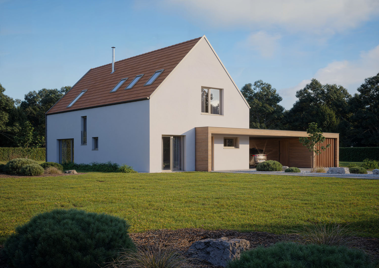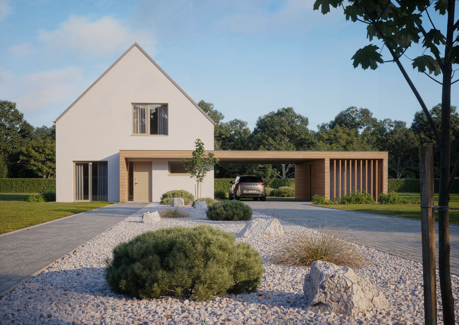 HELUZ SPACE zaujme na první pohled svým nadčasovým a elegantním designem, který se skvěle hodí jak do příměstských lokalit, tak do městského prostředí i na venkov. Čisté linie, kompaktní tvar a střecha bez přesahů dodávají domu moderní charakter a zároveň zajišťují funkčnost bez kompromisů. Výrazným architektonickým prvkem je elegantní přístřešek, který chrání vstupní část a poskytuje kryté stání pro auto.