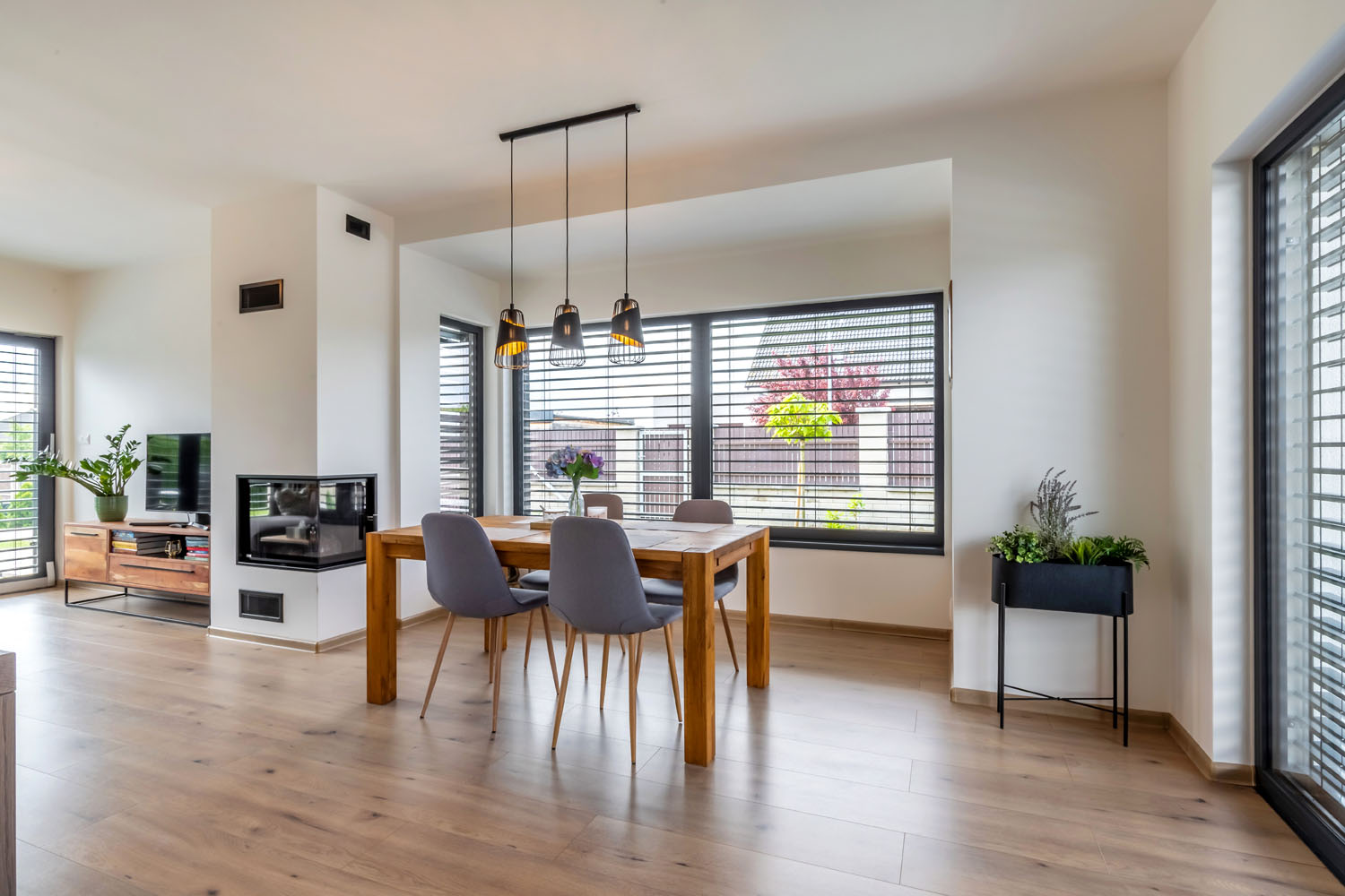 Zajímavým prvkem je také předsazený prosklený výklenek, který rozšiřuje obývací prostor. Nabízí se možnost vytvořit zde například klidné čtecí zákoutí, majitelé domu se rozhodli jej využít pro jídelnu. Celý dům vybavili převážně dřevěným nábytkem a prvky s dřevodekorem, hřejivé vyznění interiéru doladili světlými neutrálními barvami a černými doplňky.