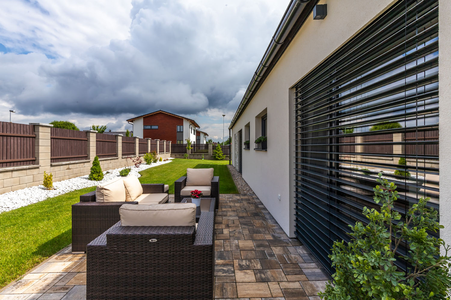 Exteriér zaujme čistou linií, kombinací omítky a obkladu z přírodního kamene i velkými francouzskými okny, která přivádějí do interiéru maximum denního světla. Na ochranu proti přehřívání jsou opatřena předokenními žaluziemi.