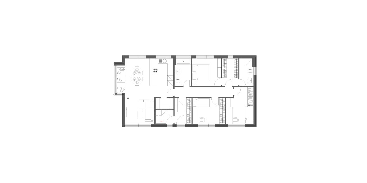Dispozice je rozdělena na společný obývací prostor a soukromou část, kde se nacházejí dva dětské pokoje, koupelna a uzavřené apartmá rodičů s vlastní koupelnou a šatnou – tzv. rodičovský blok. Toto řešení se v praxi velmi osvědčilo, a proto jej společnost Lucern dřevostavby využívá v řadě svých projektů. Dominantou celého domu je otevřený prostor kuchyně s ostrůvkem, jídelnou a obývacím pokojem, kde nechybí moderní krb. Má okna do tří stran, takže sem sluníčko svítí po celý den. Oproti katalogovému řešení má obývací pokoj dva výstupy do exteriéru – na jižní a severní stranu – a u domu jsou hned dvě terasy. Majitelé si mohou vychutnávat posezení na sluníčku a za velkého horka na opačné straně ve stínu.