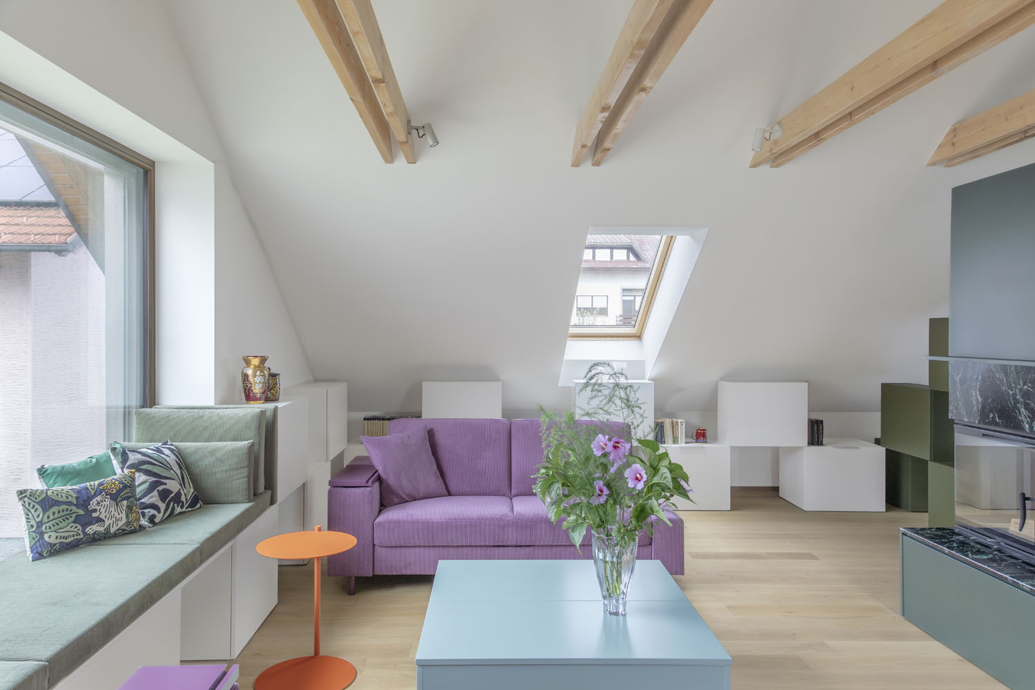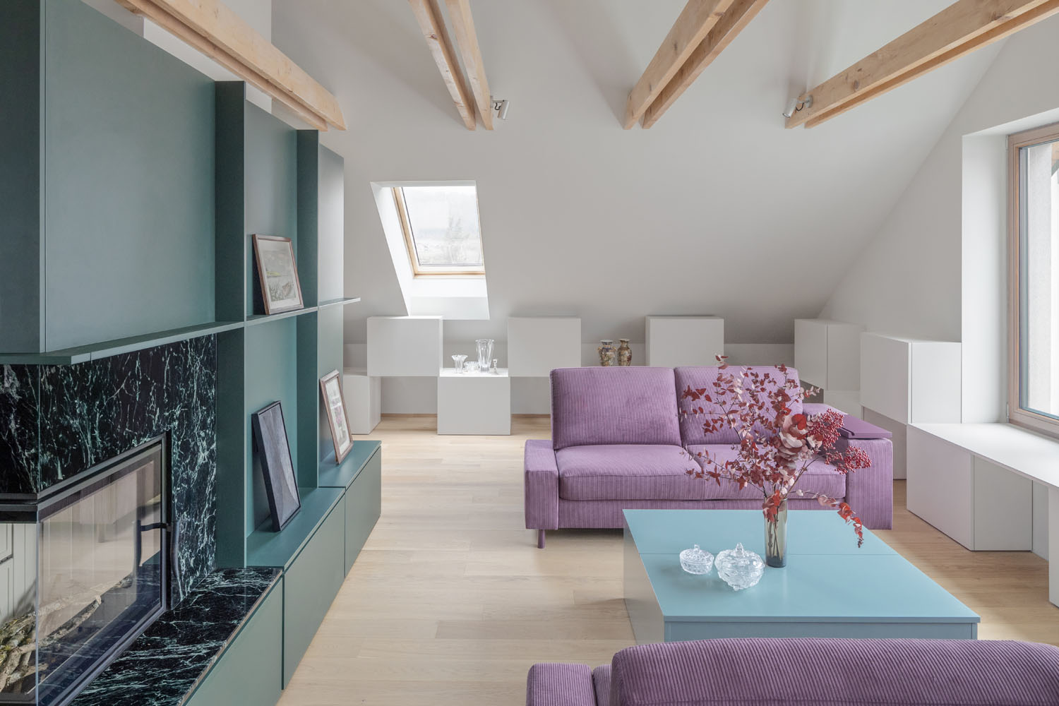Barevná paleta odráží osobnosti majitelů, s výraznými, zářivými odstíny fialové a petrolejově zelené v hlavní obývací části a klidnější zelenou v prostoru vířivky. Zvolené barvy ladí s přirozeným světlem a vytvářejí relaxační atmosféru v celém podkroví. Materiály použité při rekonstrukci jsou jednoduché, ale působivé, s barevnými panely, které zvýrazňují objem prostoru a vrhají stíny, umocňující pocit hloubky a textury.
