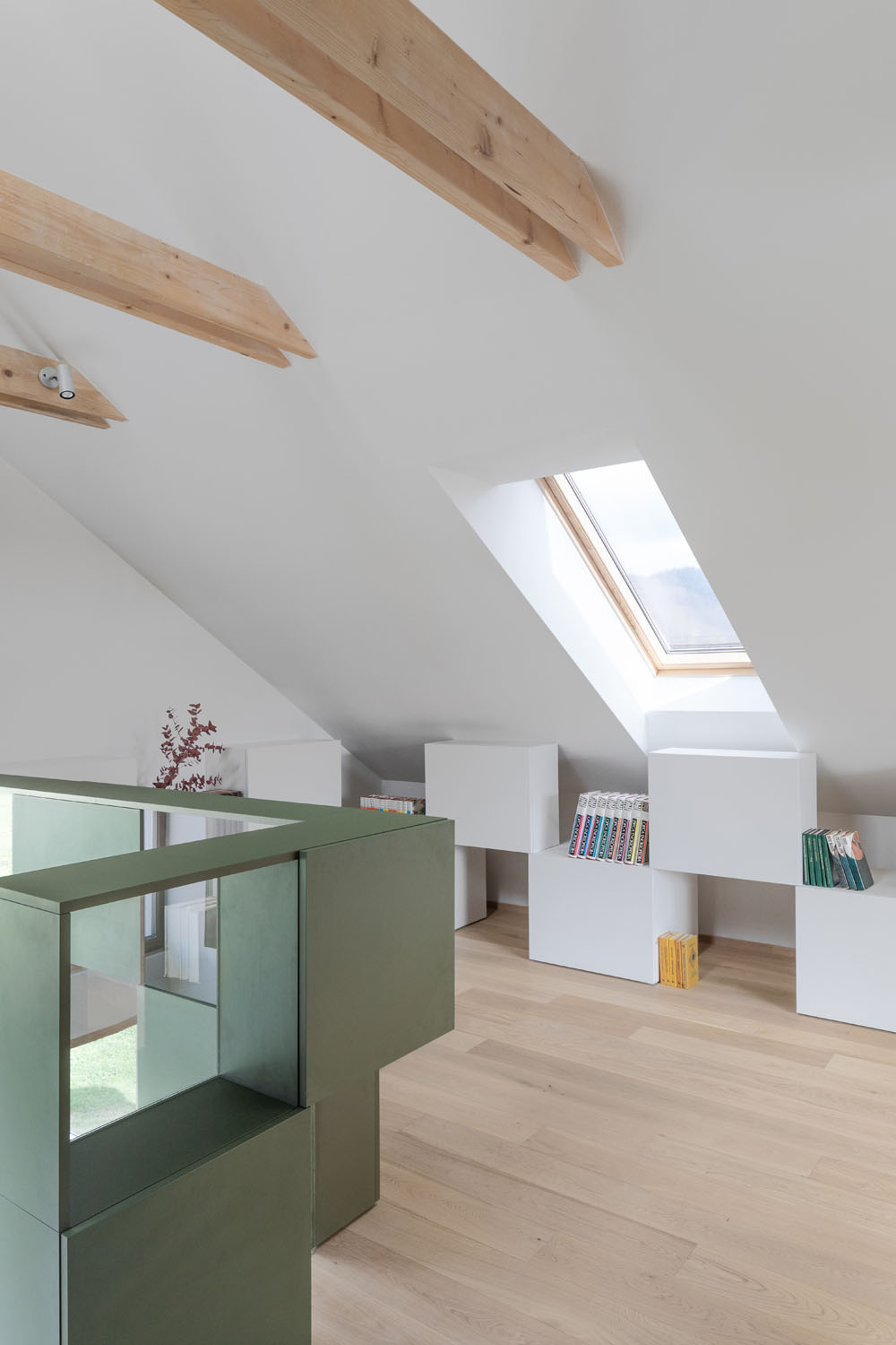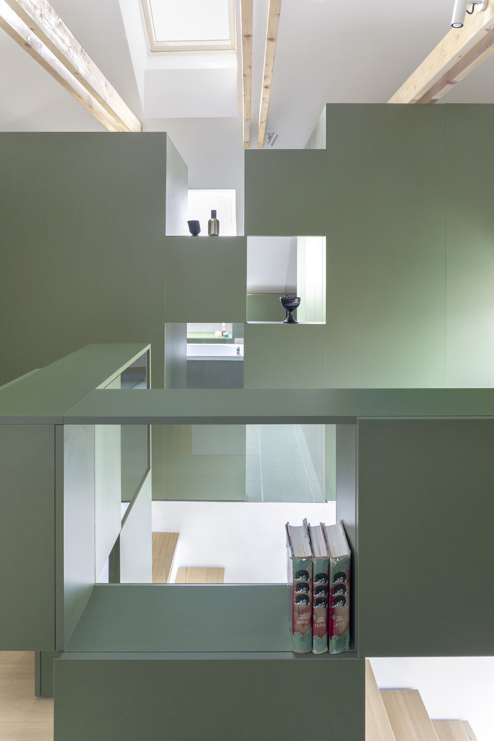 Před rekonstrukcí byla půda klasickým skladištěm nepotřebného harampádí. Vize majitelů pro úpravu podkroví však přesahovala myšlenku pouhého obývacího pokoje: Přáli si spoustu polic, knihovnu, útulný prostor pod oknem na čtení i relaxační kout se saunou. Architektka Tina Hočevar pečlivě vážila vztahy a návaznosti typického sklonu střechy půdy, možné objemy nábytku, barvy i světlo. Promyšleným umístěním krbu, skříní, sauny a vany vytvořila plynulé přechody mezi otevřeným společným prostorem a intimní lázeňskou zónou. Krychlové skříňky, strategicky umístěné po stranách místnosti, slouží jako funkční úložné prostory i jako výstavní plochy pro knihy, obrazy a rodinné suvenýry, které prostoru dodávají osobní rozměr.