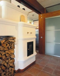 Dominantou obytné haly a zároveň předělem mezi ní a kuchyňkou jsou mohutná šamotová kamna od moravských kamnářů. Ta dodávají domu ono příznačné teplo domova, jaké nikdy nemůže navodit teplovodní podlahové topení, které je však hlavním vytápěcím systémem domu.