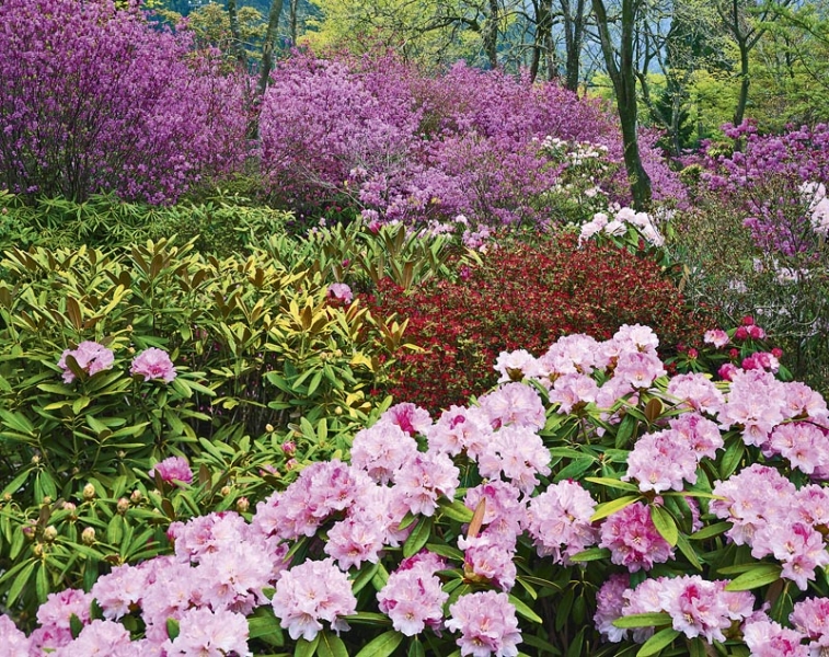 Rododendrony mnoha odstínůV zahradě roste nespočet rododendronů s květy v odstínech od bílé a nažloutlé přes růžovou, oranžovou, červenou, fialovou, purpurovou a modrou až po nahnědlé. Málokterá dřevina je tak oblíbená jako velkokvěté, bohatě kvetoucí kultivary rododendronů. Jejich obrovské množství umožňuje vytváření podobně nádherných zahrad a parků, kde někdy dotvářejí kulisu jen neutrální doplňkové dřeviny. Rododendrony jsou vřesovcovité dřeviny (Ericaceae), obývající asi v tisícovce druhů nejen Evropu, ale také Severní Ameriku a Austrálii. Centrum jejich rozšíření leží v jihovýchodní Asii, nejvíce mrazuvzdorných druhů pochází z Nepálu. Najdeme mezi nimi přes 20 metrů vysoké stromy i sotva 20 cm dorůstající plazivé keříky, druhy stálezelené i opadavé, jimž se často nepřesně říká azalky. Většina rododendronů, jako v této zahradě, má keřovitý vzrůst s hustě rozvětvenými kmínky a větvemi. Kořenová soustava je mělká, složená převážně z jemných kořínků. Pěstování rododendronů je podle slov zámeckých zahradníků snadné, ale je třeba respektovat jejich požadavky, které vycházejí z přírodních stanovišť. Stálezelené druhy se tak snažili umístit na sever nebo západ do lehkého stínu, kde jsou navíc chráněné před prudšími větry. Opadavým druhům, které nejsou tak citlivé, se daří i na slunci. Právě v západní Evropě, kde je díky oceánu vlhčí vzduch a mírnější zima, snesou zvláště kultivary rododendronů mnohem více slunce než u nás. Úplně všechny však potřebují stále vlhkou půdu. |