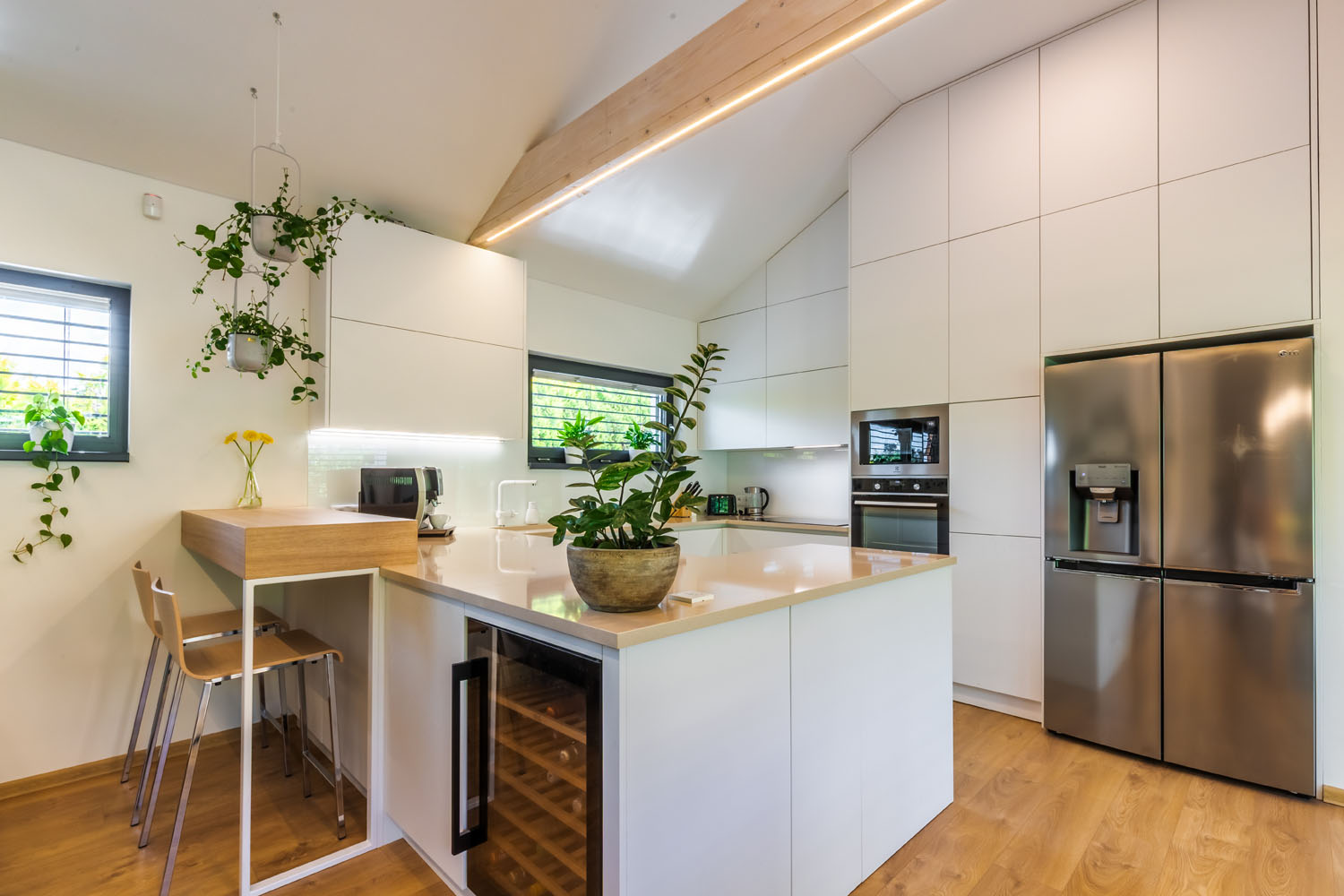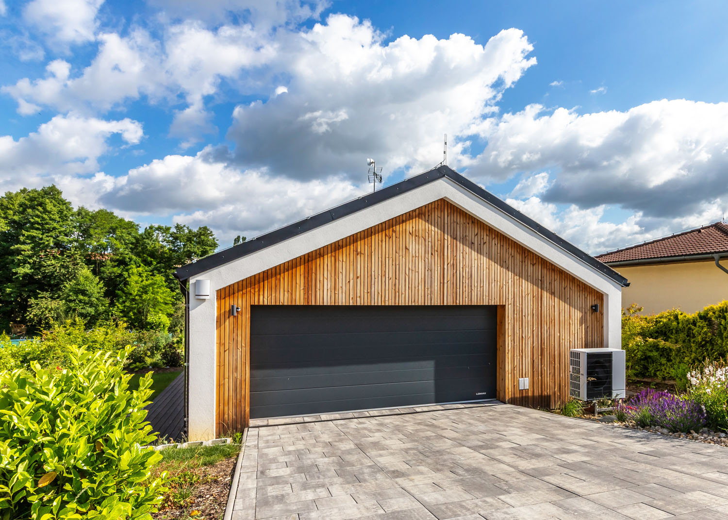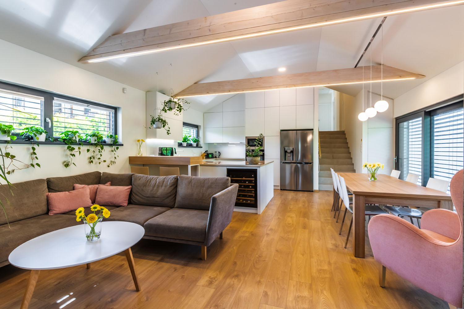 Dům vytápí tepelné čerpadlo, které zajišťuje komfort i nízké provozní náklady. Interiér okouzlí svou vzdušností a světlostí – vysoké stropy s odhalenými trámy, velká okna s venkovními žaluziemi a útulný design v přírodních tónech vytvářejí harmonické prostředí pro život. Zahrada navazuje na architekturu domu s citem pro detail – dřevěná terasa, trvalkové záhony i kamenné prvky vytvářejí příjemné zákoutí pro relaxaci i hravé odpoledne s dětmi. Tento dům je dokonalou ukázkou moderního a udržitelného bydlení s přesahem.