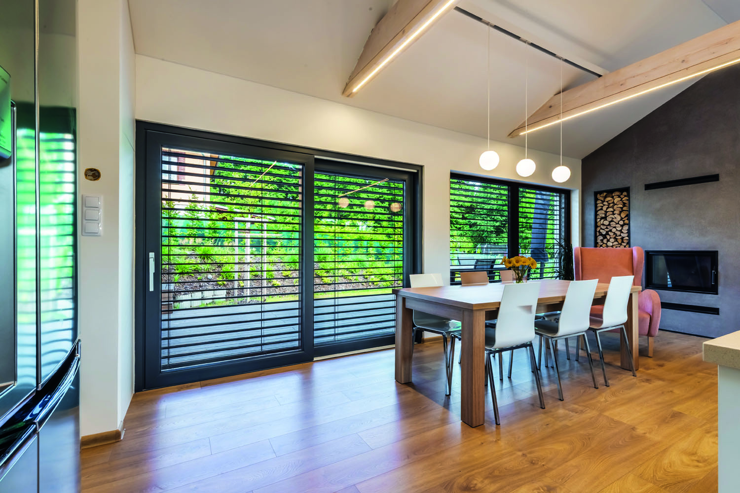 Prostor otevřený do krovu a prosvětlený ze dvou stran působí příjemně vzdušně. Dva HS portály vedou na dřevěnou terasu, situovanou podél východní fasády. Přes obývací pokoj se prochází do zadní části domu, do samostatného rodičovského apartmá s vlastní šatnou a koupelnou.